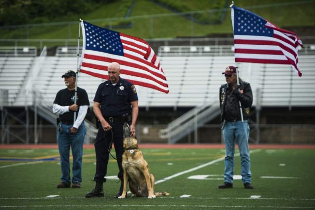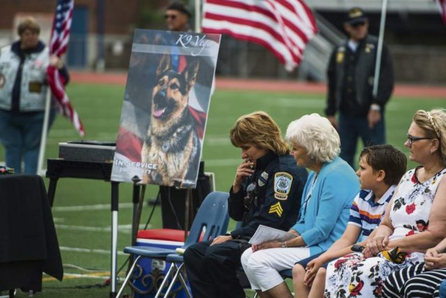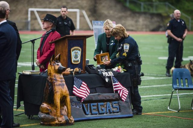 Alrededor de cien personas se reunieron el pasado sábado para celebrar un funeral en memoria de Vegas, un perro policía recientemente fallecido. El funeral se llevó a cabo en el estadio de rubgy Norwin High School